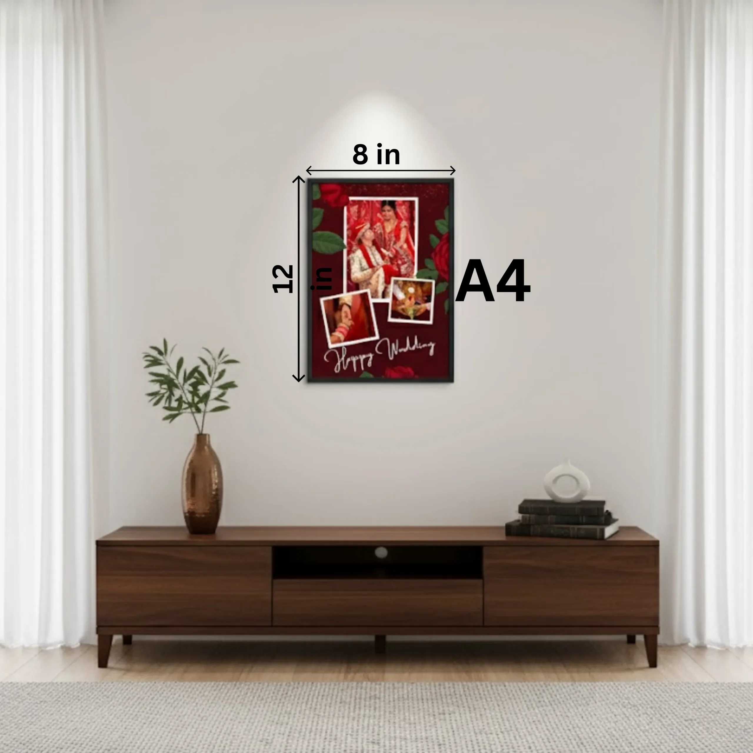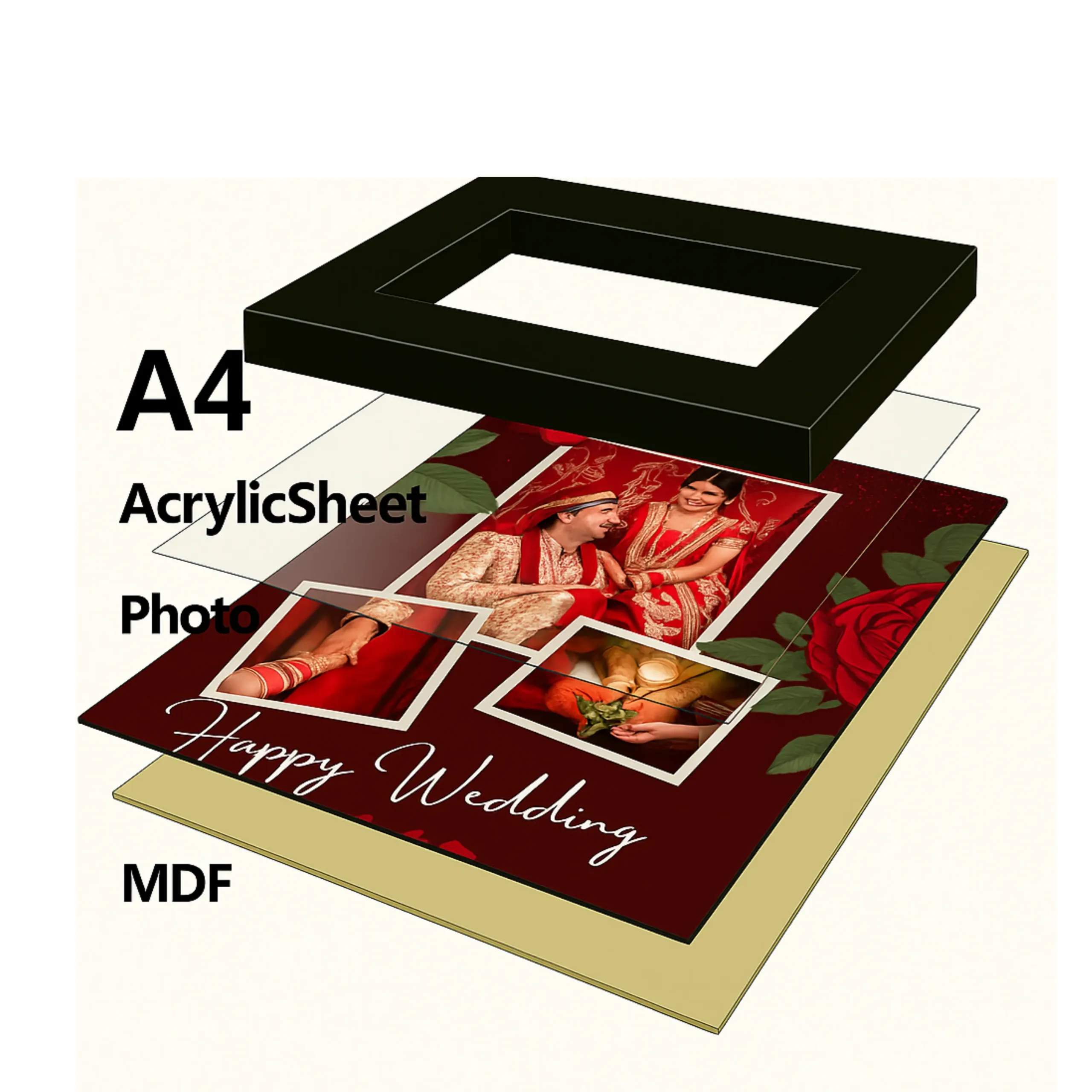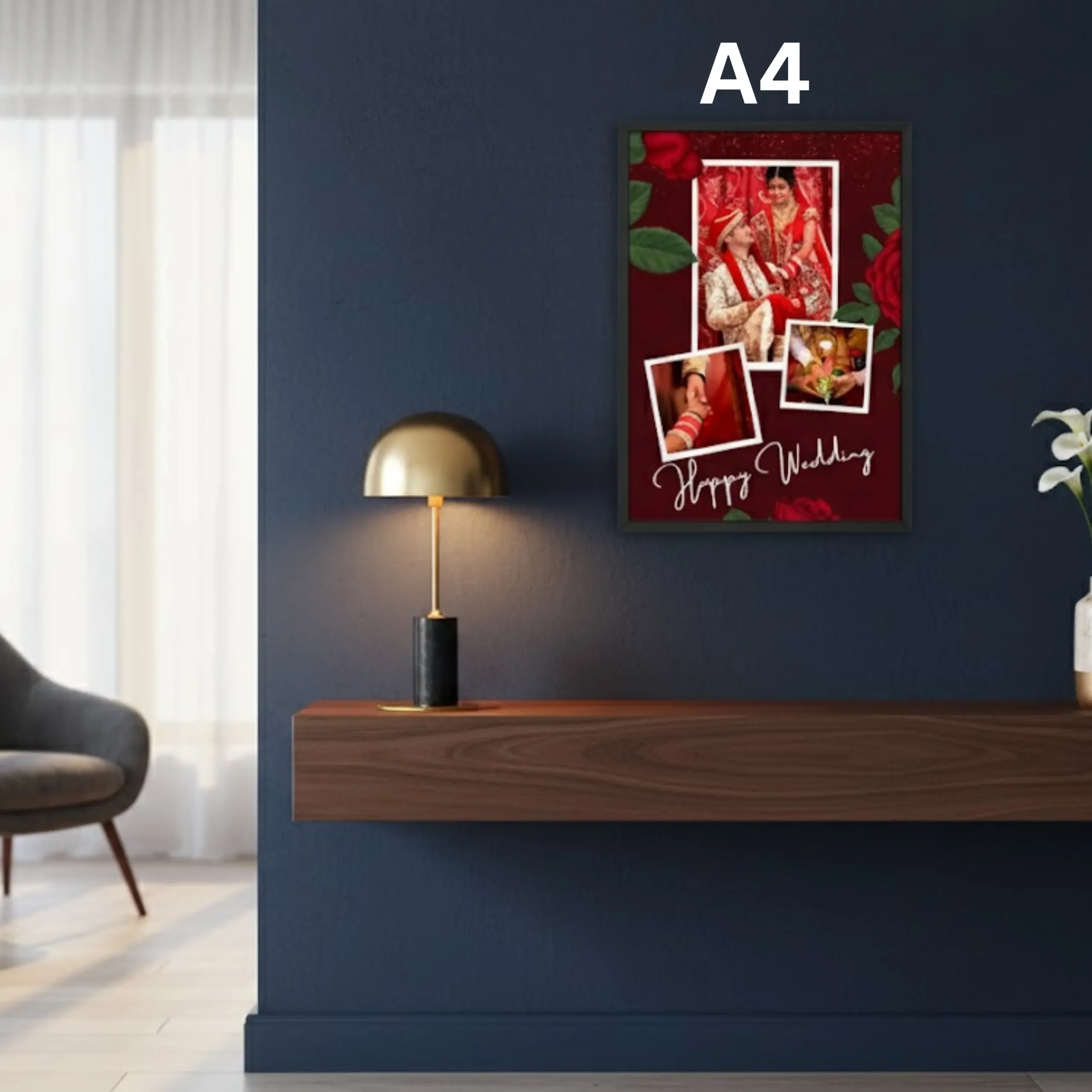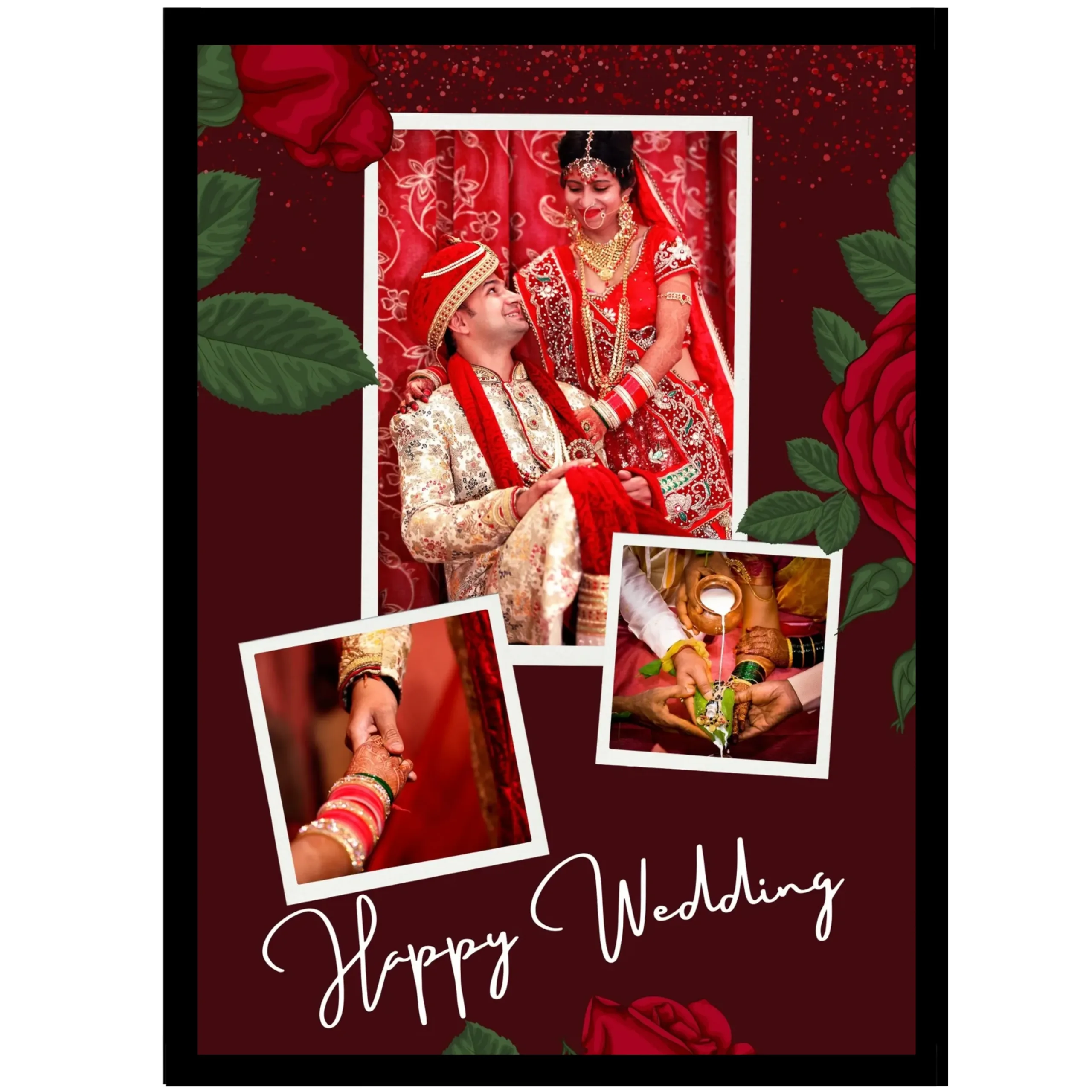Romantic Red Rose Wedding Frame – Personalized A4 Collage (3 Photos) – Anniversary Gift for Couple
